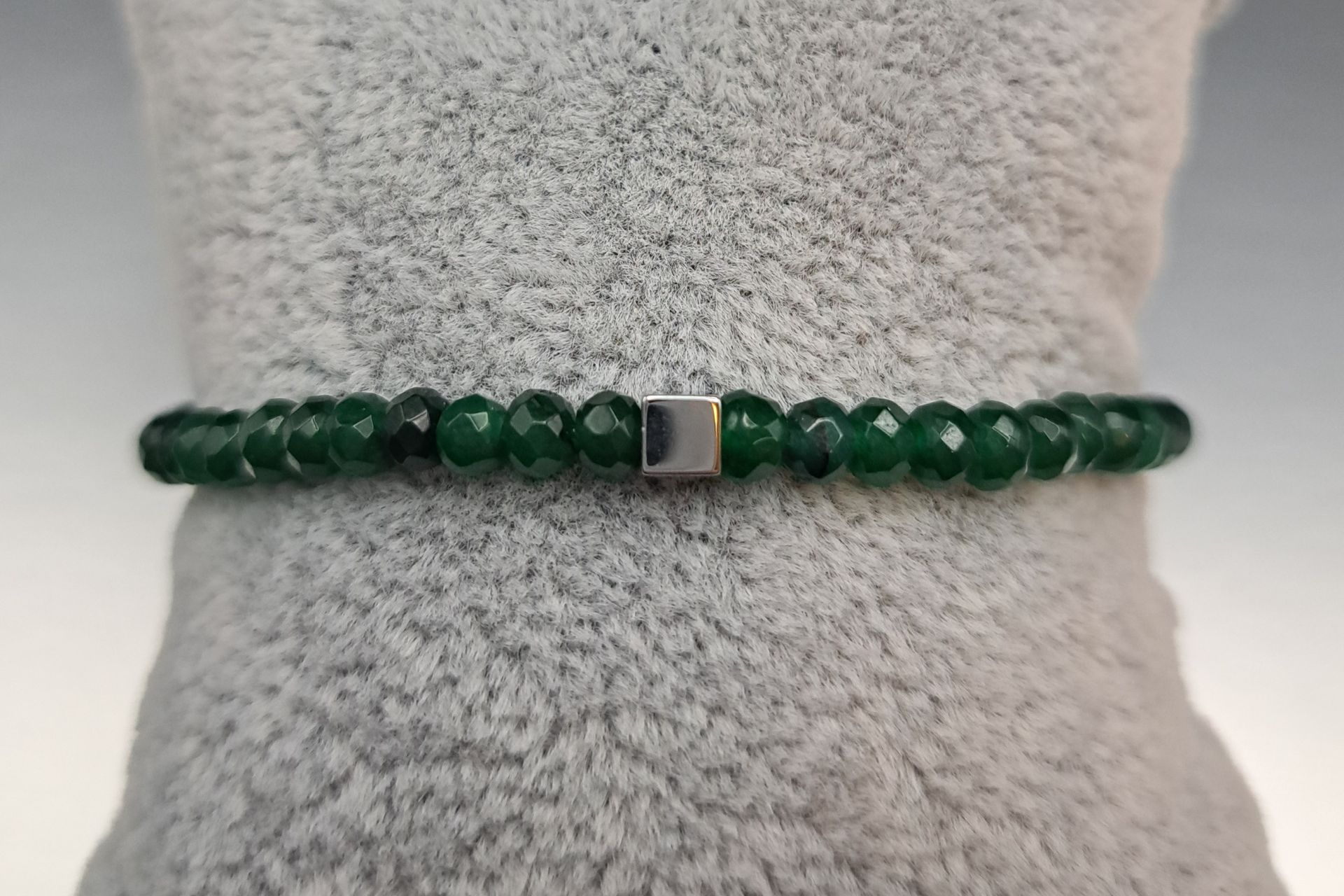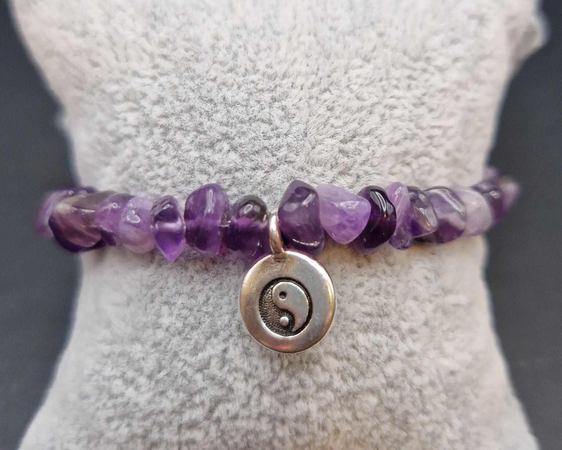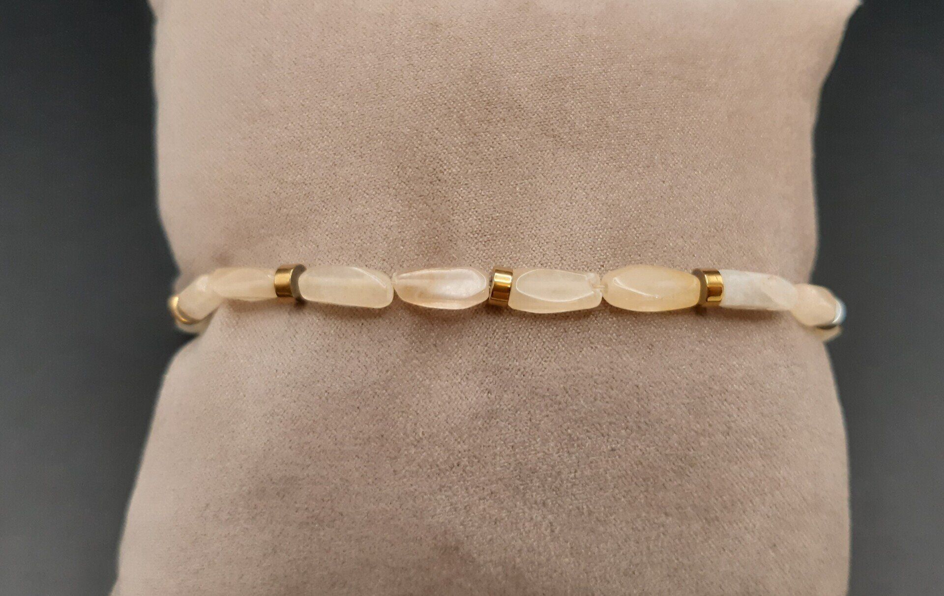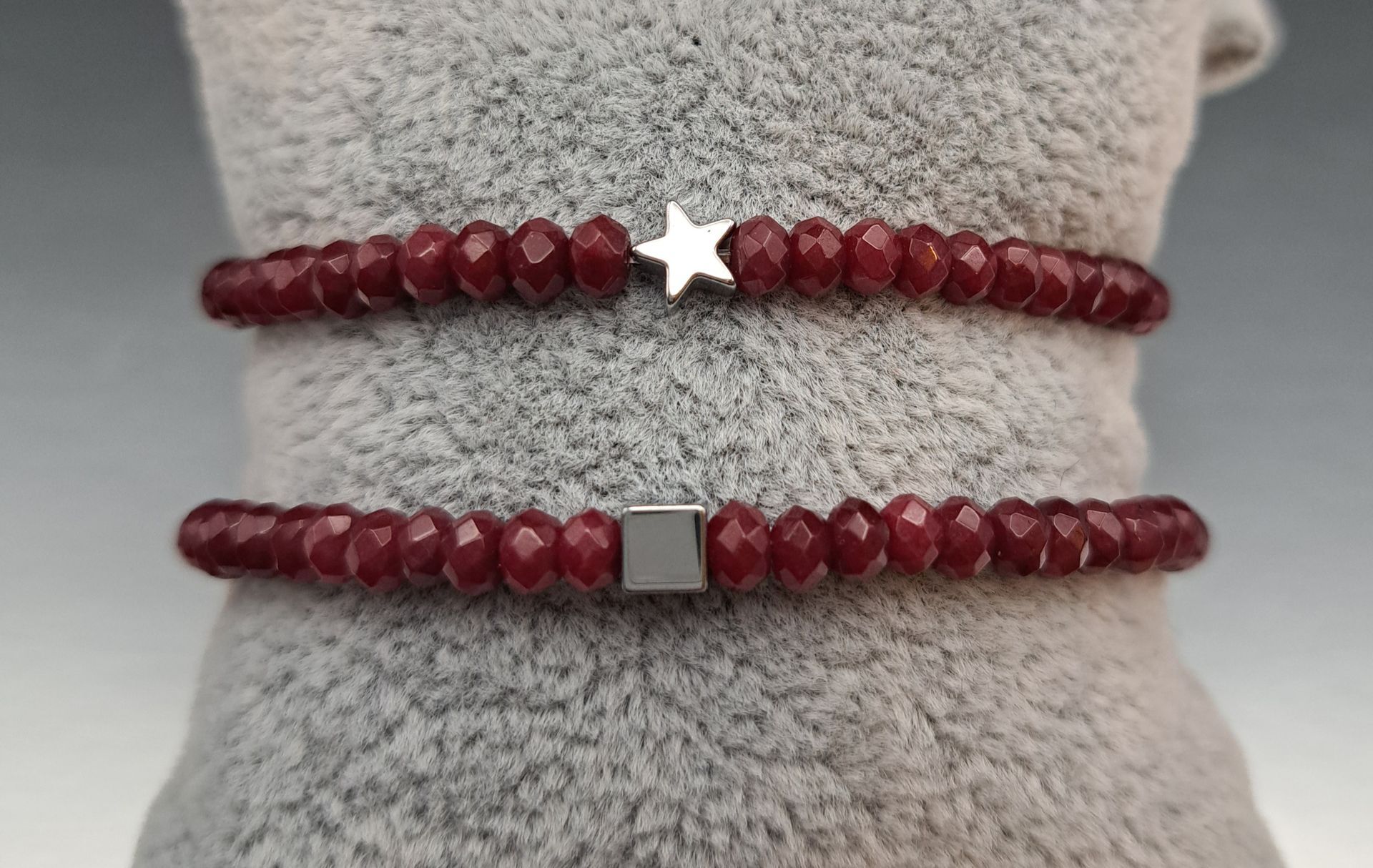 werden zumeist auf elastischem Gummiband aufgezogen, da reguläre Kettenverschlüsse mit einer Hand schwer zu öffnen und zu schließen sind. Das elastische Gummiband leiert kaum aus, sofern man es pfleglich behandelt. Armbänder können aber auf Wunsch auch auf normalen Schmuckdraht gezogen und mit Magnetverschlüssen oder sogenannten Knebelverschlüssen versehen werden. Manche Armbänder sind aus 925 Sterlingsilber und umfassen schöne Edelsteine.