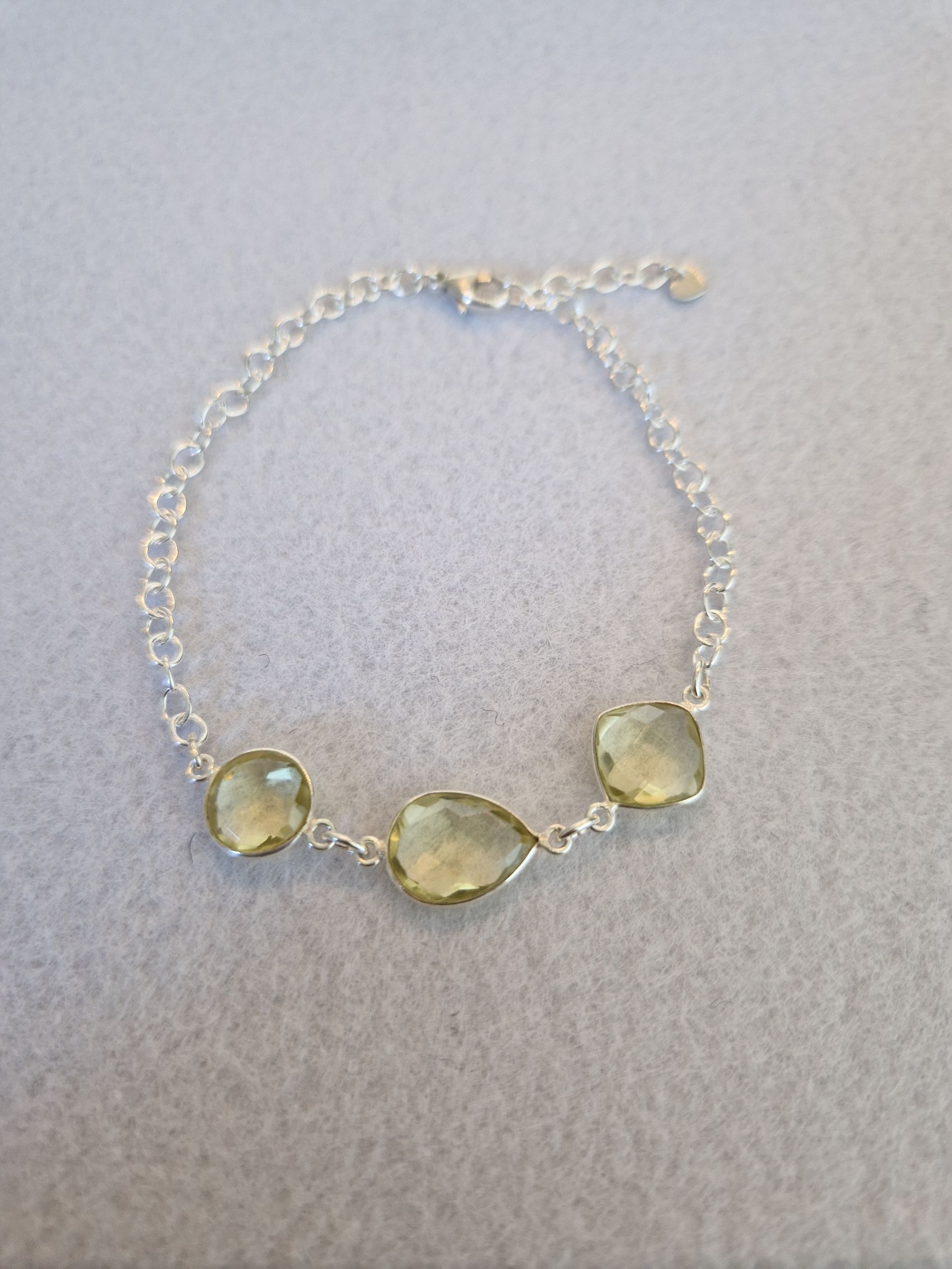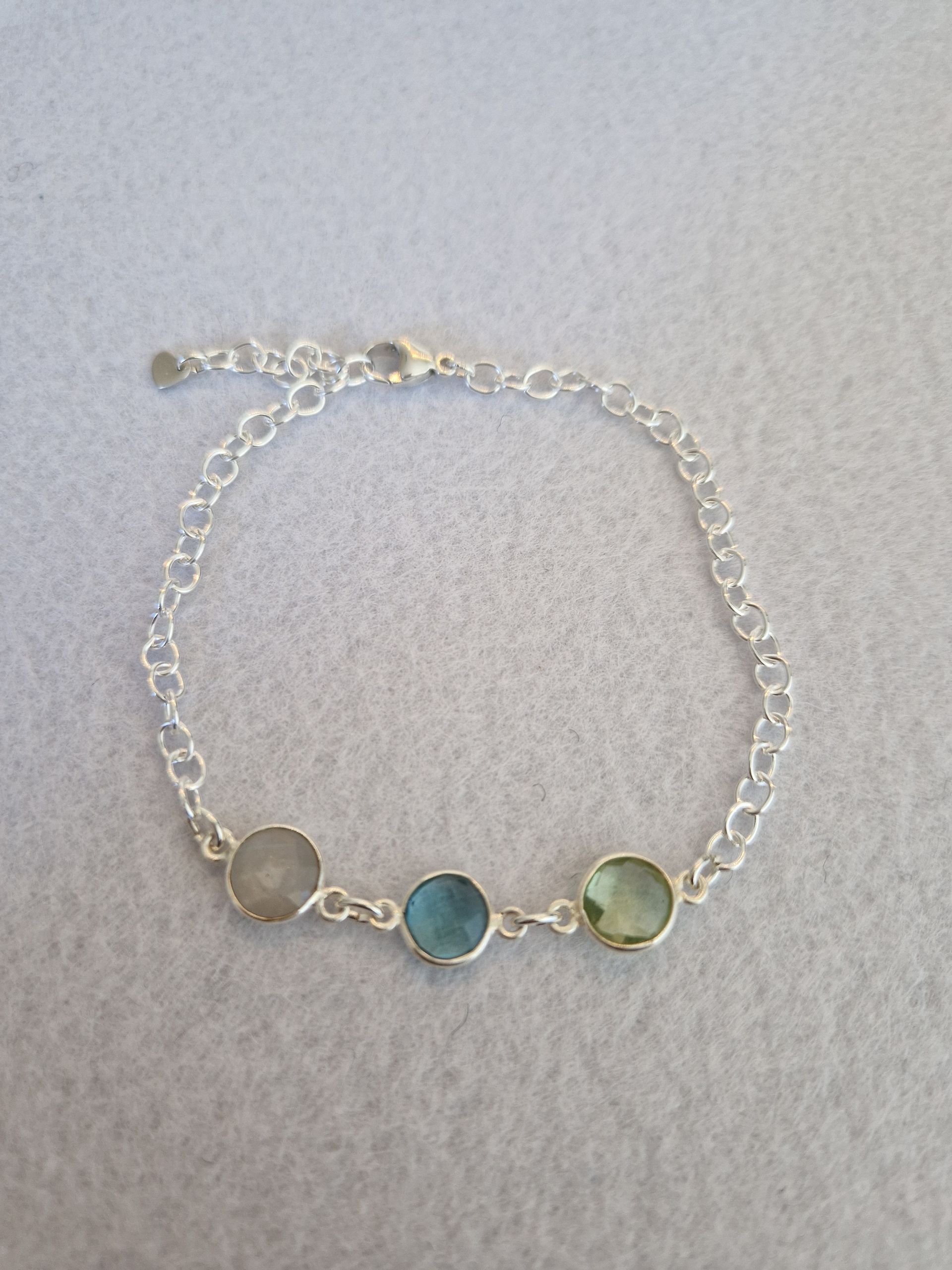 Armband aus 925 Silber mit wunderschön facettiertem Mondstein, blauem Quarz und grünem Quarz ( alle ca 9mm), die in 925 Silber gefasst sind.