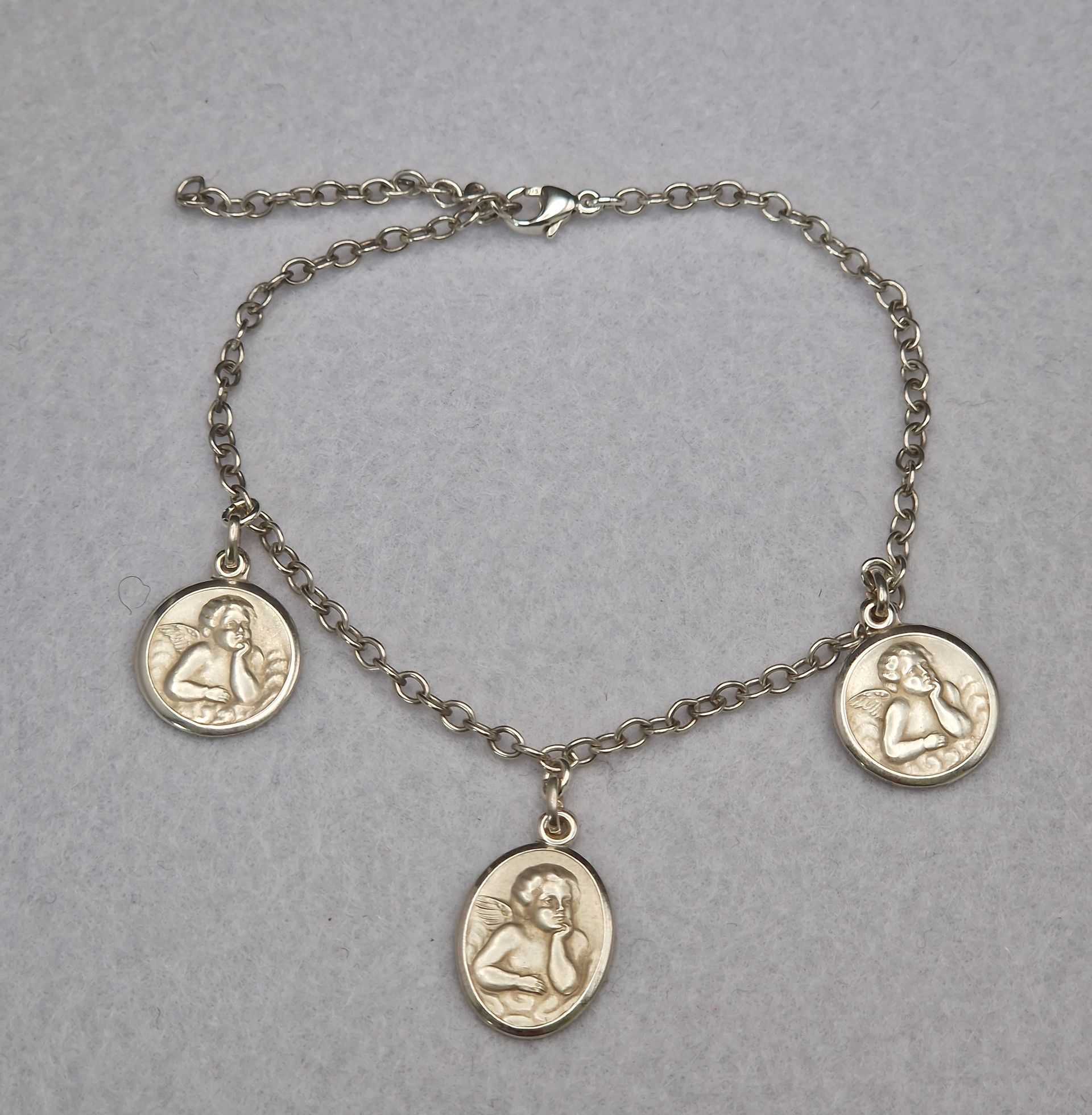 Armband aus 925 Silber mit drei mittelgroßen Engel-Anhängern aus 835 Silber.