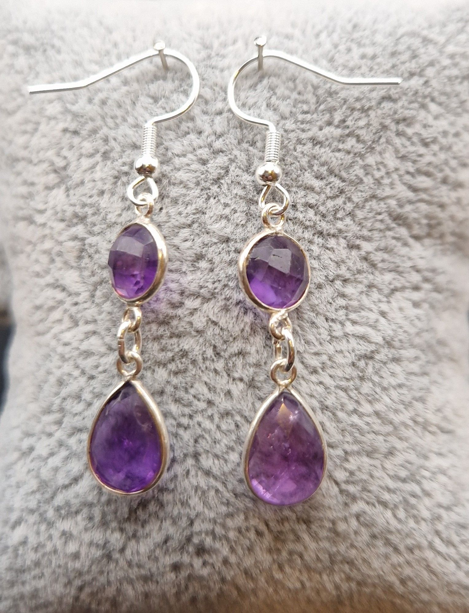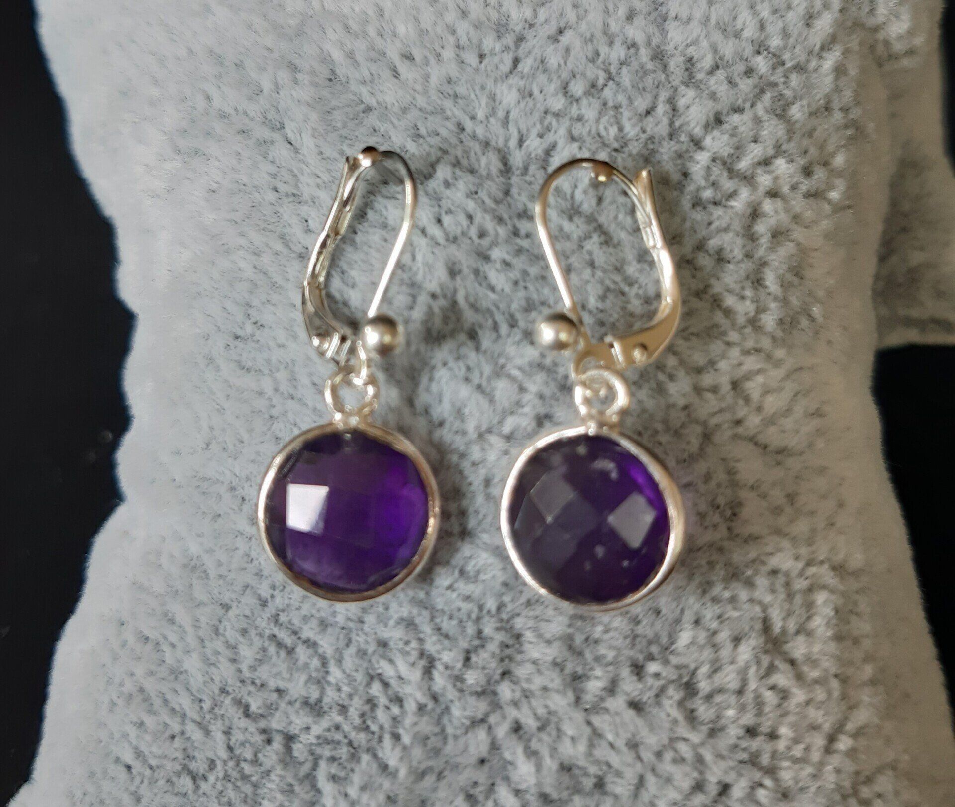 Amethyst- Tropfen (11mm) und rund (9mm) beide in 925 Sterlingsilber gefasst, versilberte Ohrhänger
