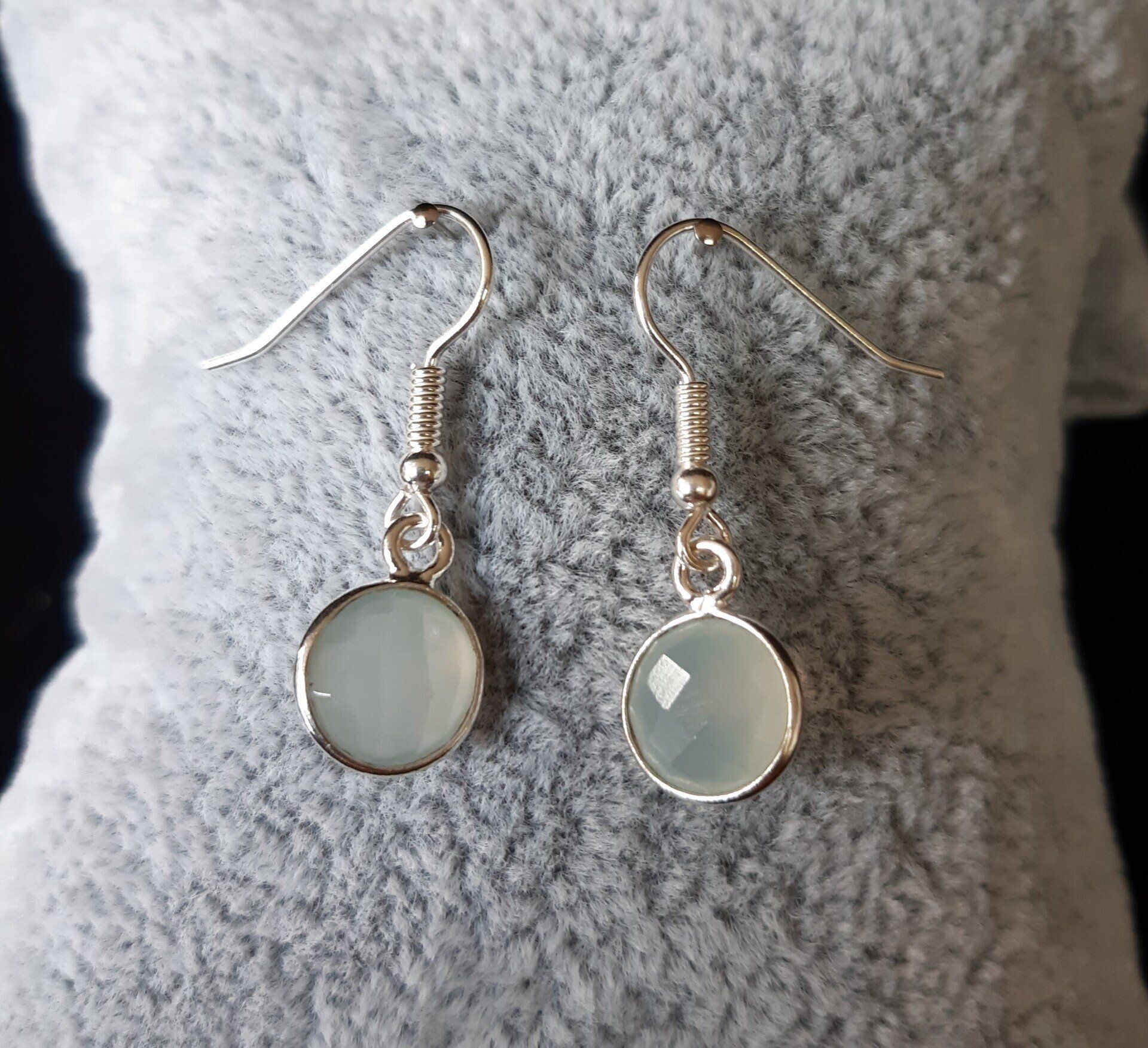 Prehnit rund (blass grün) in 925 Sterlingsilber gefasst 11 mm, versilberte Ohrhänger