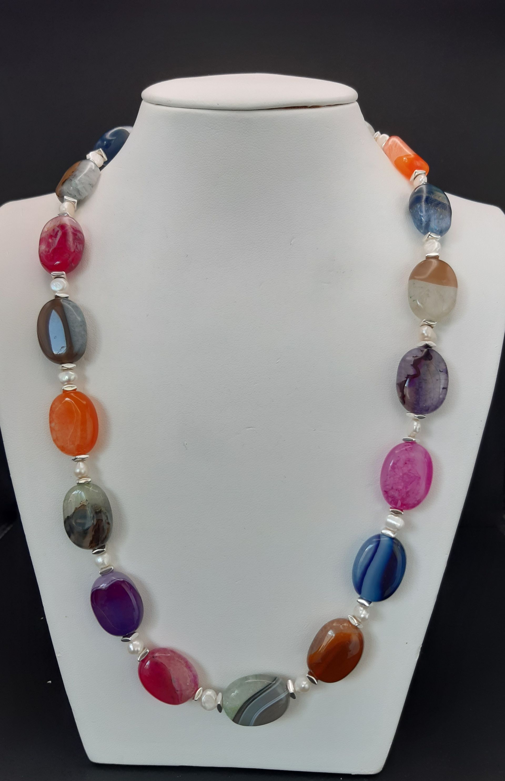Bunte Achatovale mit Süßwasserperlen und versilberten Hämatitzwischenperlen