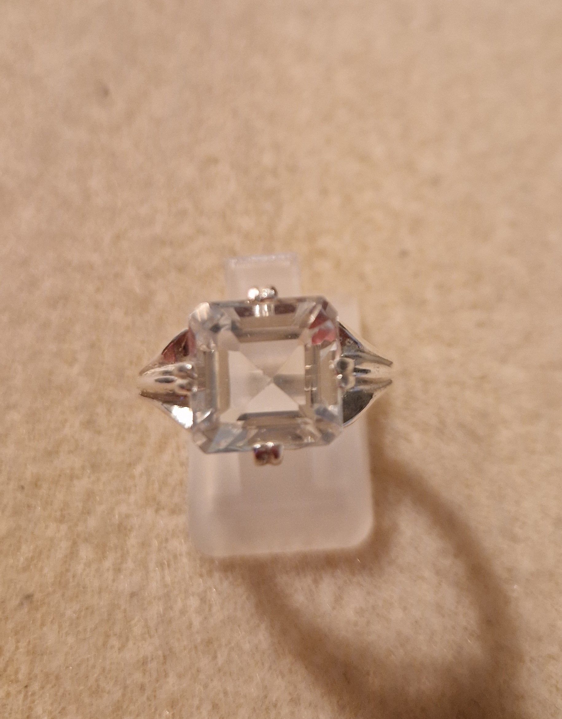 Ring aus 925 Sterlingsilber besetzt mit einem wunderschön facettierten Bergkristall (Durchmesser 12mm) in Prinzessschliff in Krappenfassung. Ringgröße 54 ( bzw 14/7)