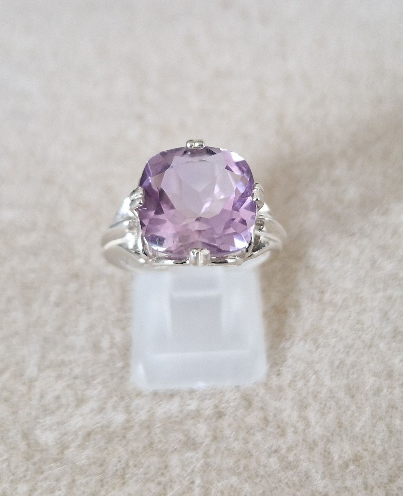Ring aus 925 Sterlingsilber besetzt mit einem wunderschön facettierten quadratischen, hellen Amethyst (12mm) in Kissenschliff in Krappenfassung. Ringgröße 17 bzw 7