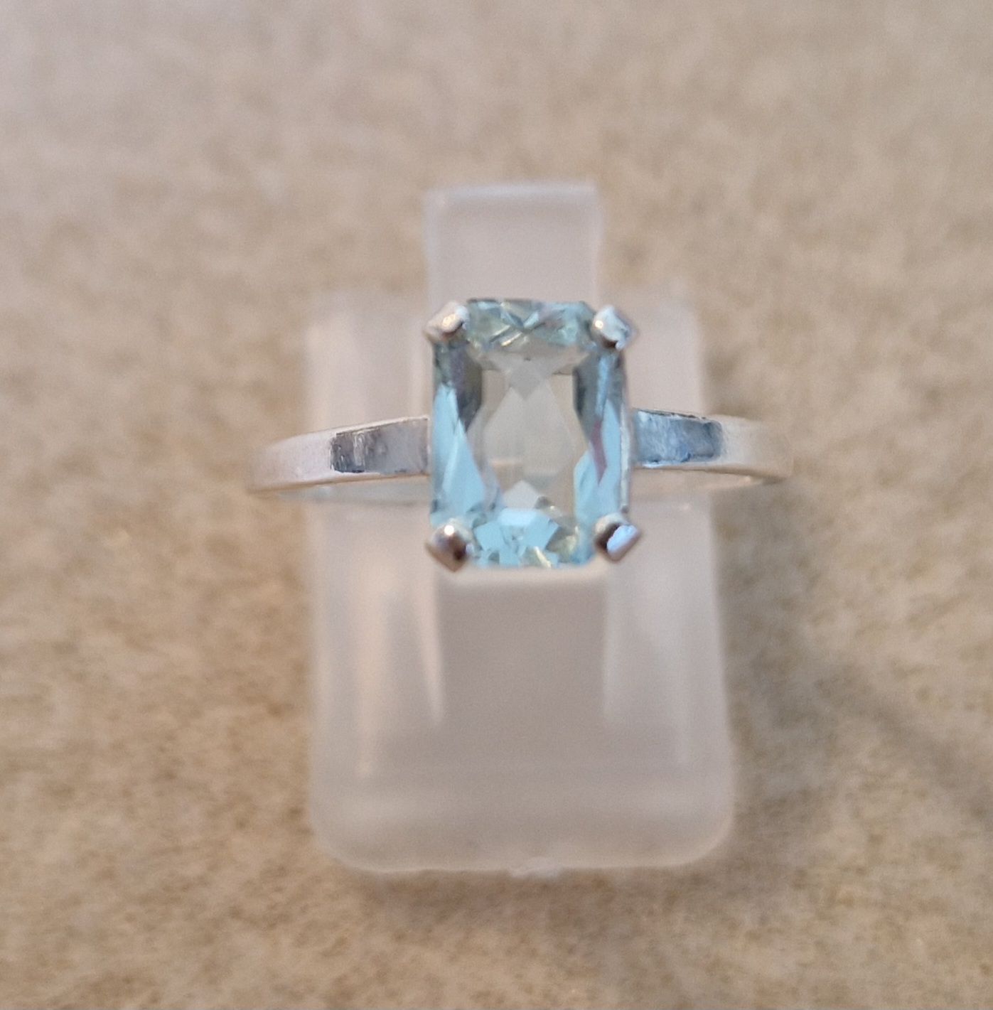 Ring aus 925 Sterlingsilber besetzt mit einem wunderschön facettierten rechteckigen Blautopaz ( 6x8mm) in Krappenfassung. Ringgröße 8