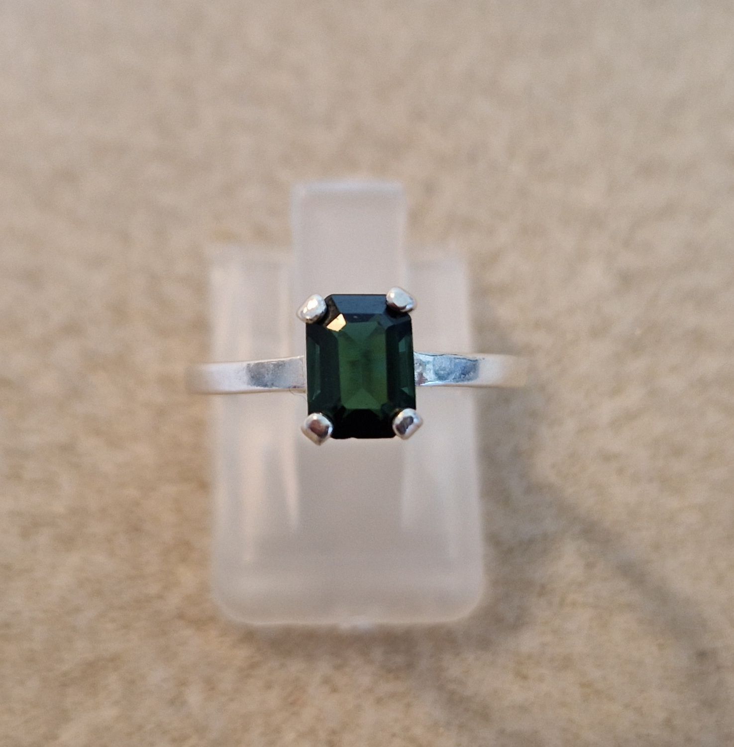 Ring aus 925 Sterlingsilber besetzt mit einem wunderschön facettierten, dunkelgrünen Turmalin ( 5x7mm) in Smaragdschliff in Krappenfassung. Ringgröße 16