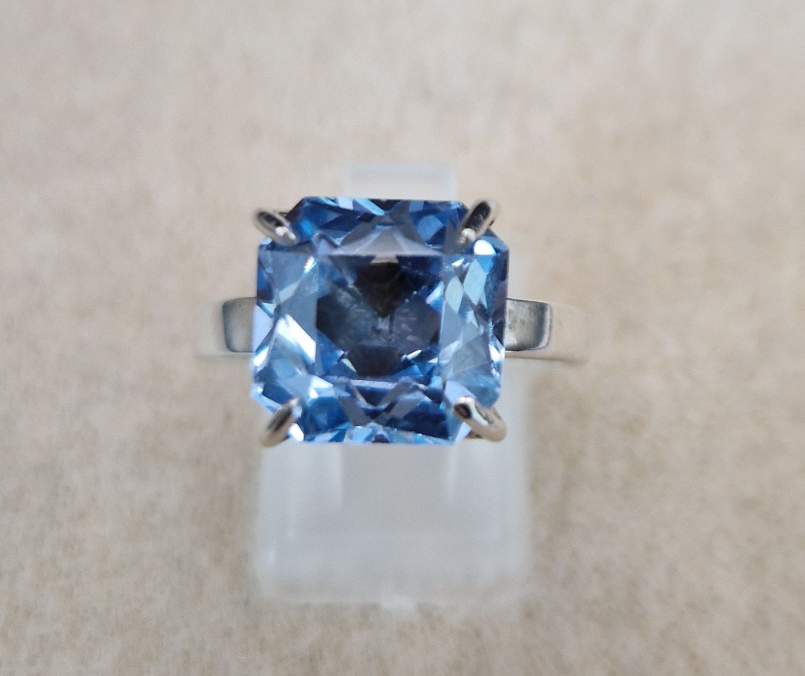 Ring aus 925 Sterlingsilber besetzt mit einem wunderschön facettierten, tefblauen, quadratischen synthetischen Aquamarin (ca 10mm) in Kissenschliff und Krappenfassung. Ringgröße 19