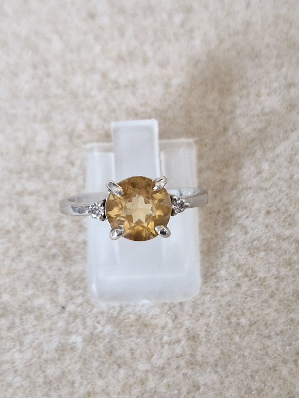 Ring aus 925 Sterlingsilber besetzt mit einem wunderschön facettierten runden Citrin ( 6mm) und zwei kleinen Zirkonen in Krappenfassung. Ringgröße 17 bzw 7