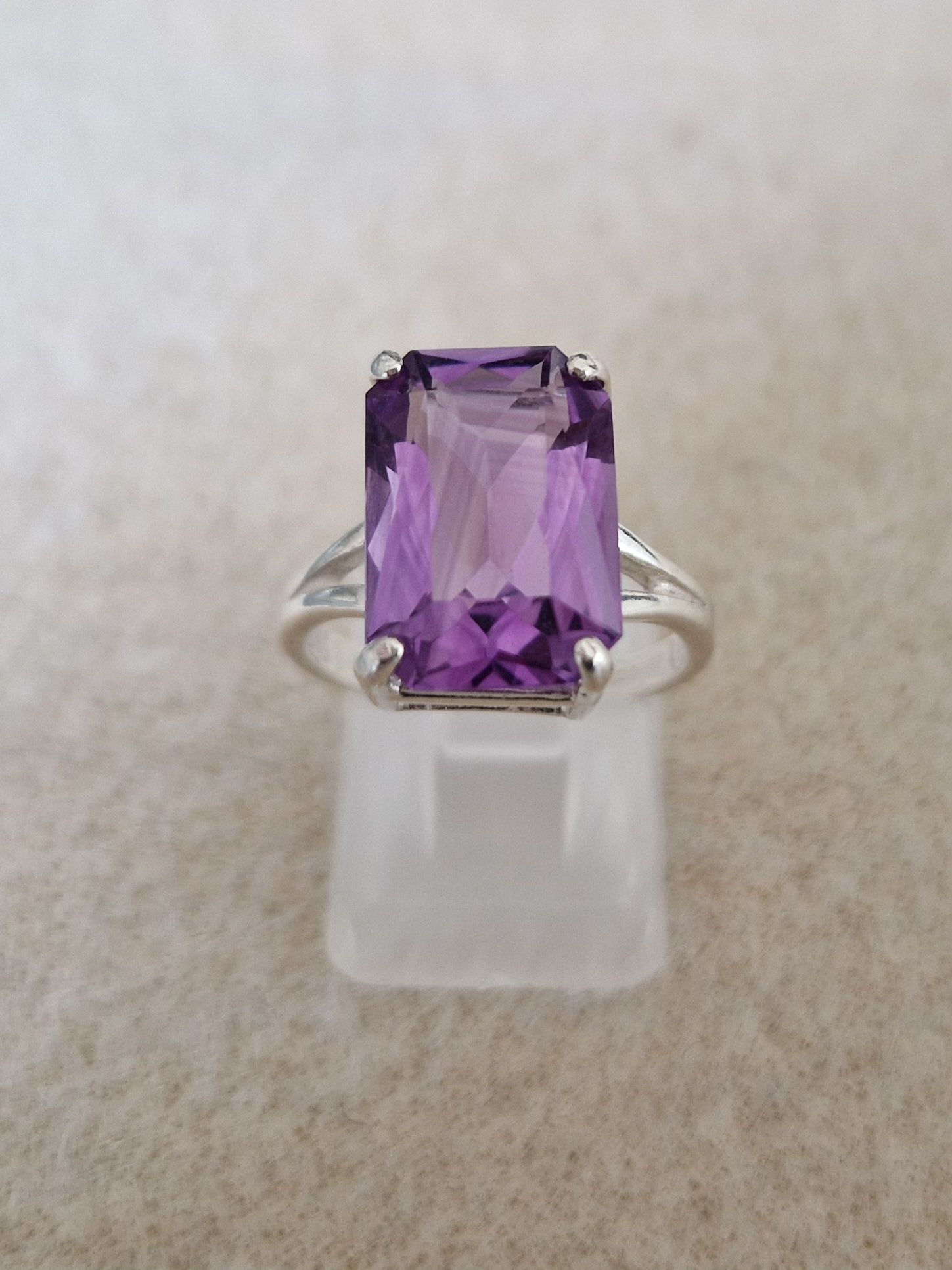Ring aus 925 Sterlingsilber besetzt mit einem wunderschön facettierten rechteckigen, dunkleren Amethyst ( 10x14mm) in Smaragdschliff in Krappenfassung. Ringgröße 17 bzw7