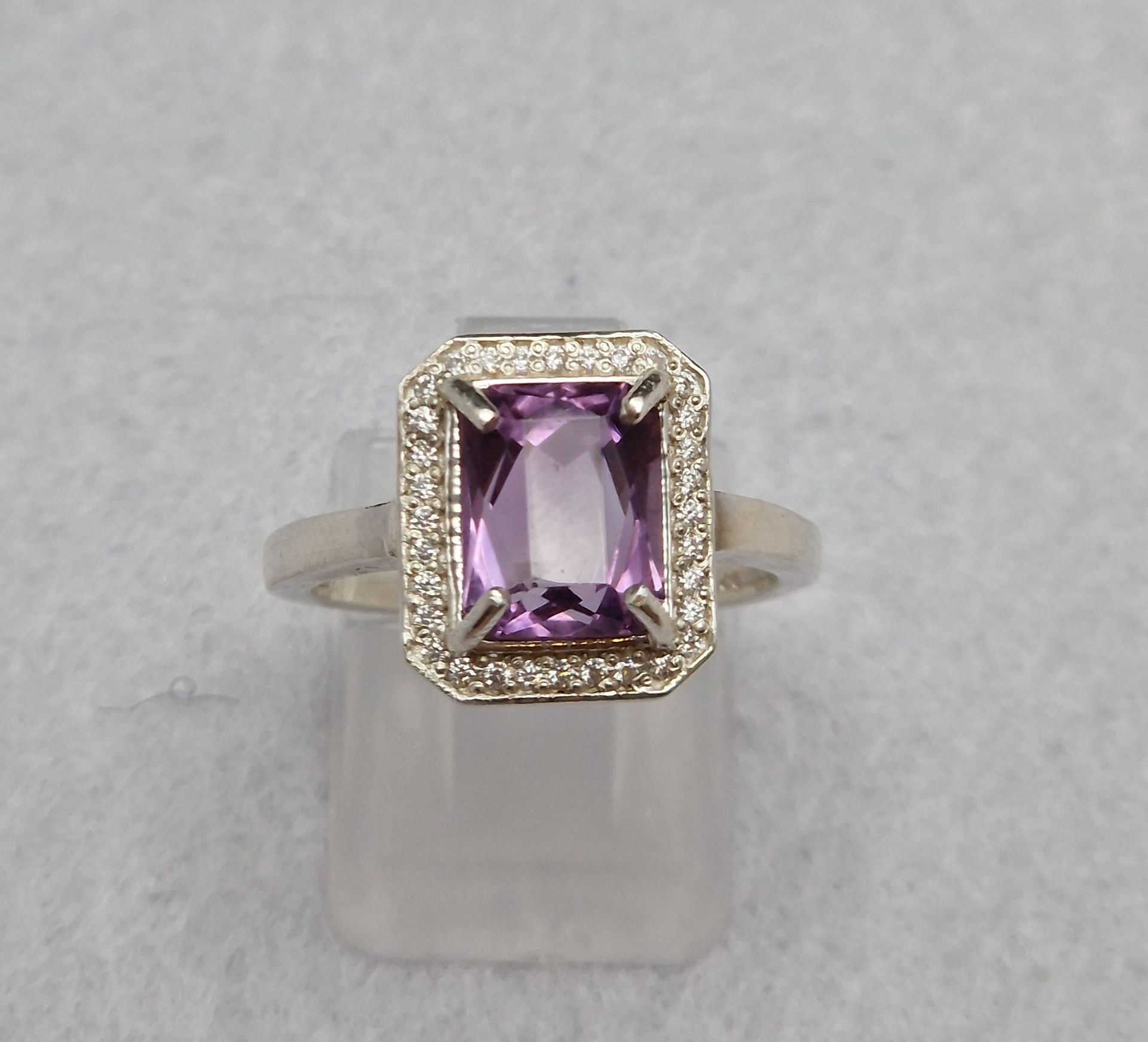 Ring aus 925 Sterlingsilber besetzt mit einem wunderschön facettierten rechteckigen, hellen Amethyst ( 10x12mm) in Smaragdschliff in Krappenfassung. Ringgröße 59 ( bzw 19)