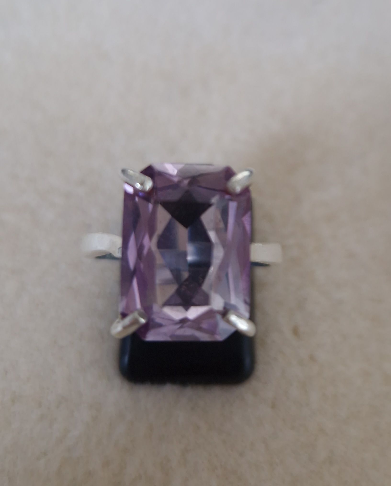 Ring aus 925 Sterlingsilber besetzt mit einem wunderschön facettierten rechteckigen, hellen Amethyst ( 11x15mm) in Smaragdschliff in Krappenfassung. Ringgröße 59 ( bzw 19)